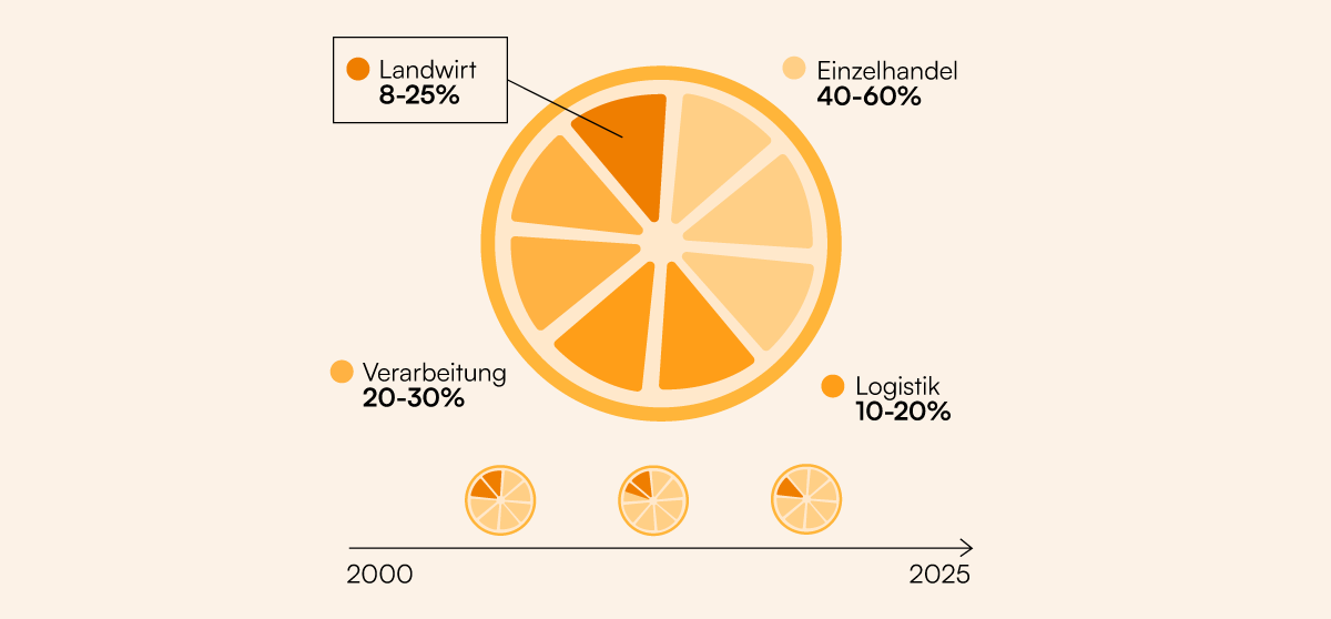 Abbildung 1. In vielen europäischen Lebensmittelketten ist der Anteil des Endpreises, der an den Landwirt geht, gering – zwischen 8 % und 25 % – und ist im Laufe der Zeit weiter gesunken. Der Einzelhandel macht häufig zwischen 40 % und 60 % des Wertes aus. (OECD & FAO, 2023; Heinrich Böll Stiftung, 2025).