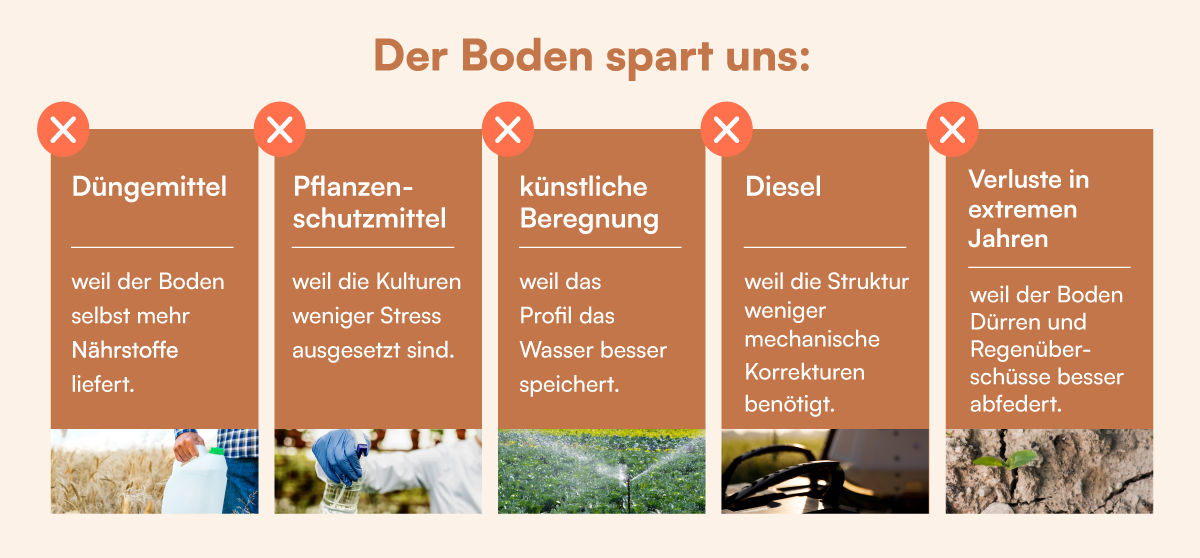• Mehr Widerstandsfähigkeit = weniger Verluste: ca. 360 €/ha/Jahr durch Reduzierung der Ertragsschwankungen, wenn sich der Boden wie ein hochwertiger Boden verhält.