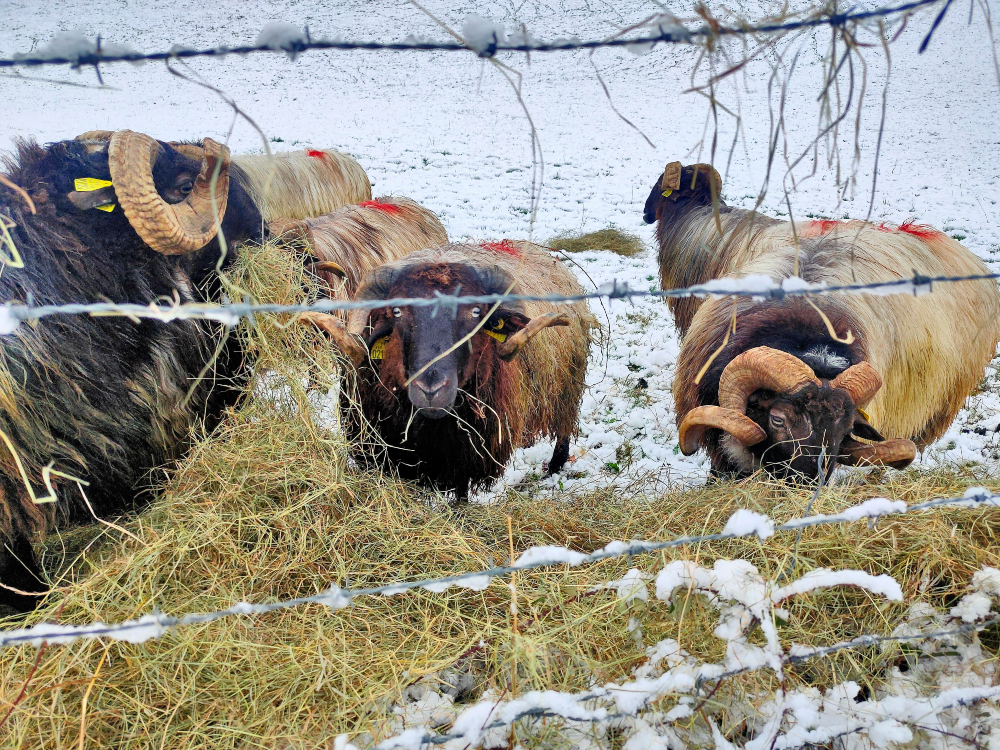 À l’automne, la météo change. Les nuits étant plus fraîches et l’herbe se faisant plus rare là-haut, il est temps de rejoindre les prairies enherbées et la bergerie. Cet hiver, les premiers agneaux ont pointé le bout de leur museau avec les premiers bêlements.
