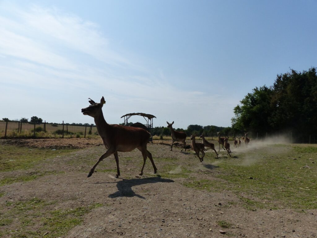 Le jour de notre visite, le 3 juillet au matin, la ferme était encore deux fois plus sexy car les faons venaient à peine de naître. Il a suffi à Patrice de remplir une mangeoire avec de l’orge pour que les mères accourent, suivies de leurs petits – timides, ils restaient en retrait pendant que les adultes se goinfraient. Les mâles, eux, ne sont jamais sortis des bois. Il faisait trop chaud pour ne pas fainéanter. Une biche, enfin, montrait un comportement très à part et nous approchait pour se faire caresser. Rien d’étonnant, c’était Bambi. Abandonnée dès la naissance, elle fut sauvée par la famille de Patrice et nourrie au biberon sur le canapé du salon. Parmi ses congénères, cette biche semi-domestique suscite désormais la crainte avec son tempérament de meneuse.