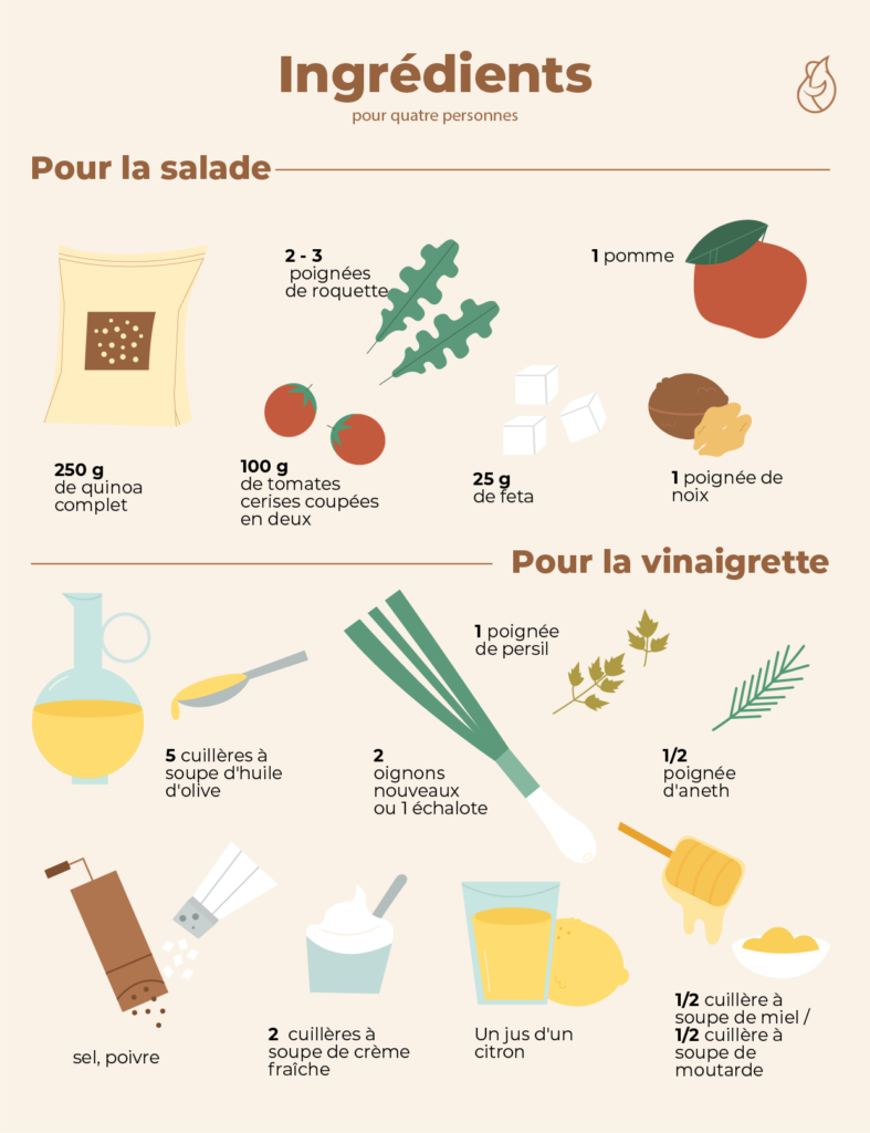 Johannes cultive du quinoa biologique dans la Hesse, en Allemagne, et il a partagé avec nous une excellente recette pour son quinoa. Cette salade saine est préparée à partir d’ingrédients locaux et fournit de nombreux nutriments, vitamines et minéraux. Nous aimons le mariage entre ces différentes saveurs et textures. Des ingrédients tels que les noix et la roquette s’harmonisent parfaitement avec l’arôme fruité de la pomme et la touche acidulée du citron. En outre, la feta et les herbes fraîches comme le persil et l’aneth complètent ce plat afin de créer une véritable expérience culinaire.