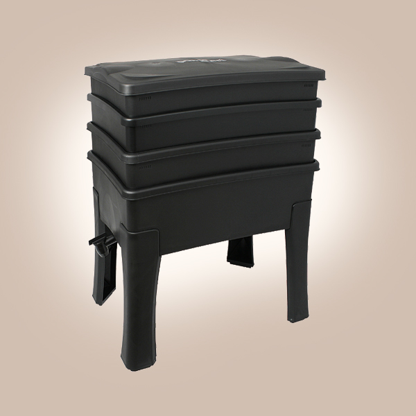 Notice sur le sol, éléments dispersés façon puzzle sur le parquet de l’entrée, j’assemble le lombricomposteur. Les plateaux percés d’une capacité de 14 litres s’empilent comme ceux d’un couscoussier. Au rez-de-chaussée de mon immeuble à lombrics, un bac plus profond affublé d’un robinet devra accueillir le jus de compost appelé aussi poétiquement le thé de vers. Il s’agit en réalité d’un liquide noirâtre plutôt dégueu mais excellent engrais. Je termine mon chantier par le toit, un couvercle percé de micros-trous pour que tout ce petit monde puisse respirer. Je dévore la notice et apprends que la forme brevetée des plateaux encourage les vers à se déplacer vers le haut pour s’alimenter, que l’écoulement de l’engrais liquide est facilité quelque soit le taux de remplissage, que le plastique est du polypropylène 100% recyclé et 100 % recyclable. Bref mon lombricomposteur s’annonce d’excellente facture.