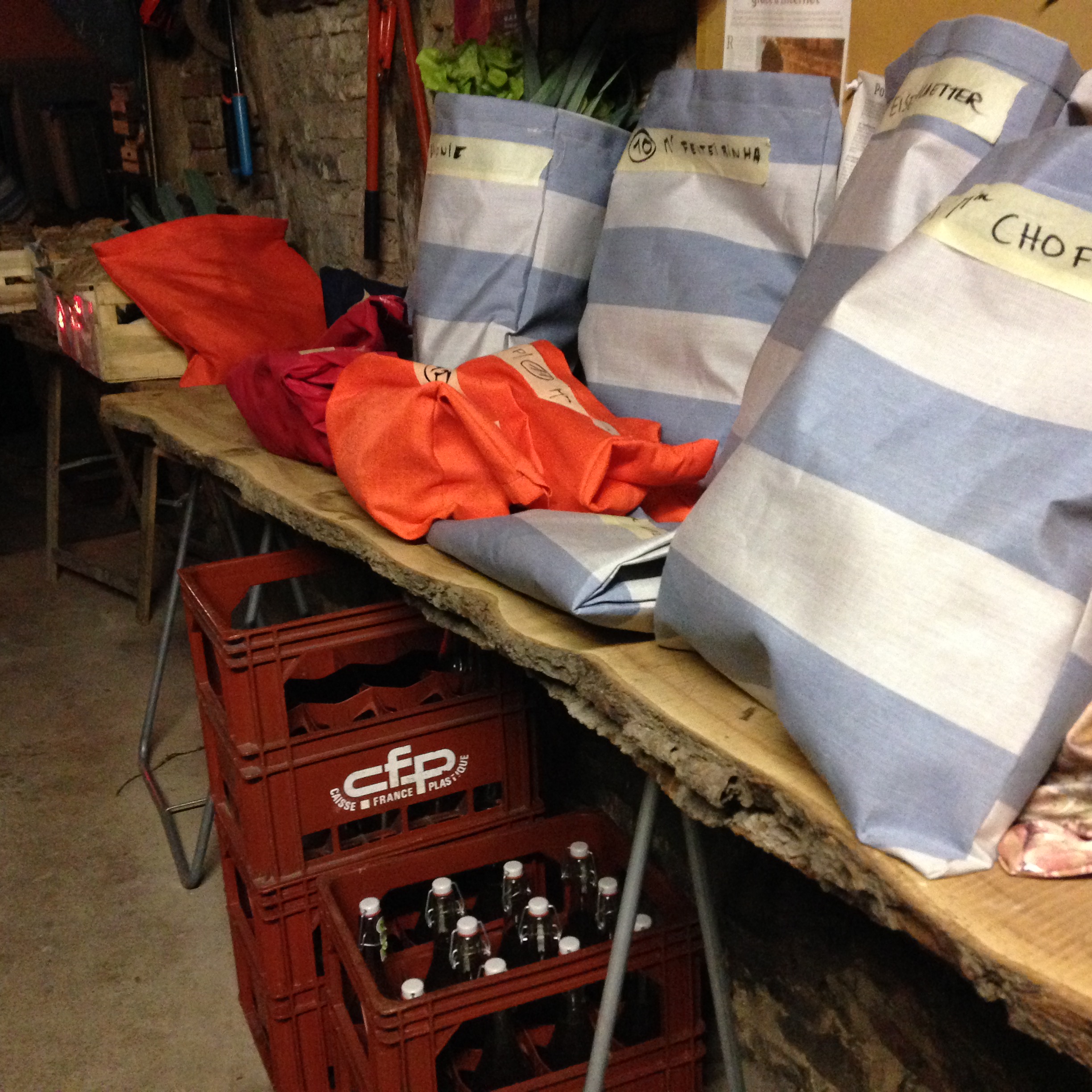Prévue depuis quelques mois, la démarche des maraîchers de Châtenois n’a pas de lien avec le fameux décret qui prévoit l’interdiction des sacs de caisse en plastique à usage unique, initialement prévue pour le 1er janvier 2016 et reportée à l’été. Le décret vise à privilégier uniquement les sacs plastiques réutilisables, les sacs  pour emballage de fruits et légumes en vrac, ou les sacs en papier ou en tissu. Pour le chou kale et les poireaux du Giessen, le tissu est parfois à fleurs, et ça égaie sacrément les distributions hivernales.
