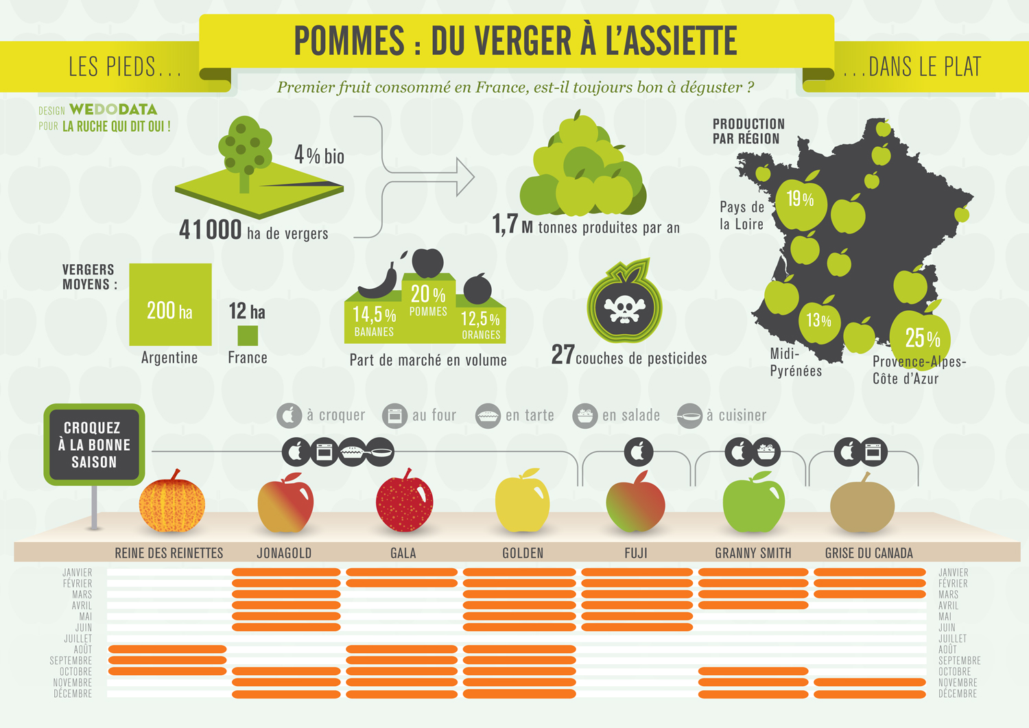 On fait quoi alors ? On choisit les variétés locales, on accepte une petite imperfection, on ne boude ni les petites ni les grosses pommes et on les mange quand c’est la saison (cf infographie). L’été, on les remplace par des framboises ou par des prunes. Et le bio ? On le privilégie bien sûr mais à une seule condition : que la pomme ait poussé sous nos climats. Voilà.