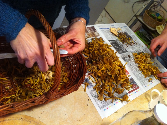 Lors de la cueillette, il convient de penser à couper les pieds, et ôter les épingles de pin pour faciliter ensuite la préparation en cuisine. Première étape : laver délicatement les champignons à l’eau courante sans trop les mouiller sinon quoi ils se gorgeraient d’eau. Ensuite, cuisiner. Evidemment, l’omelette est une possibilité. On l’a testée. Approuvée. Mais pour varier (le panier était plein après cette cueillette), nous avons essayé une soupe aux chanterelles à la crème, à la façon finlandaise. Pour quatre personnes, il nous faut :