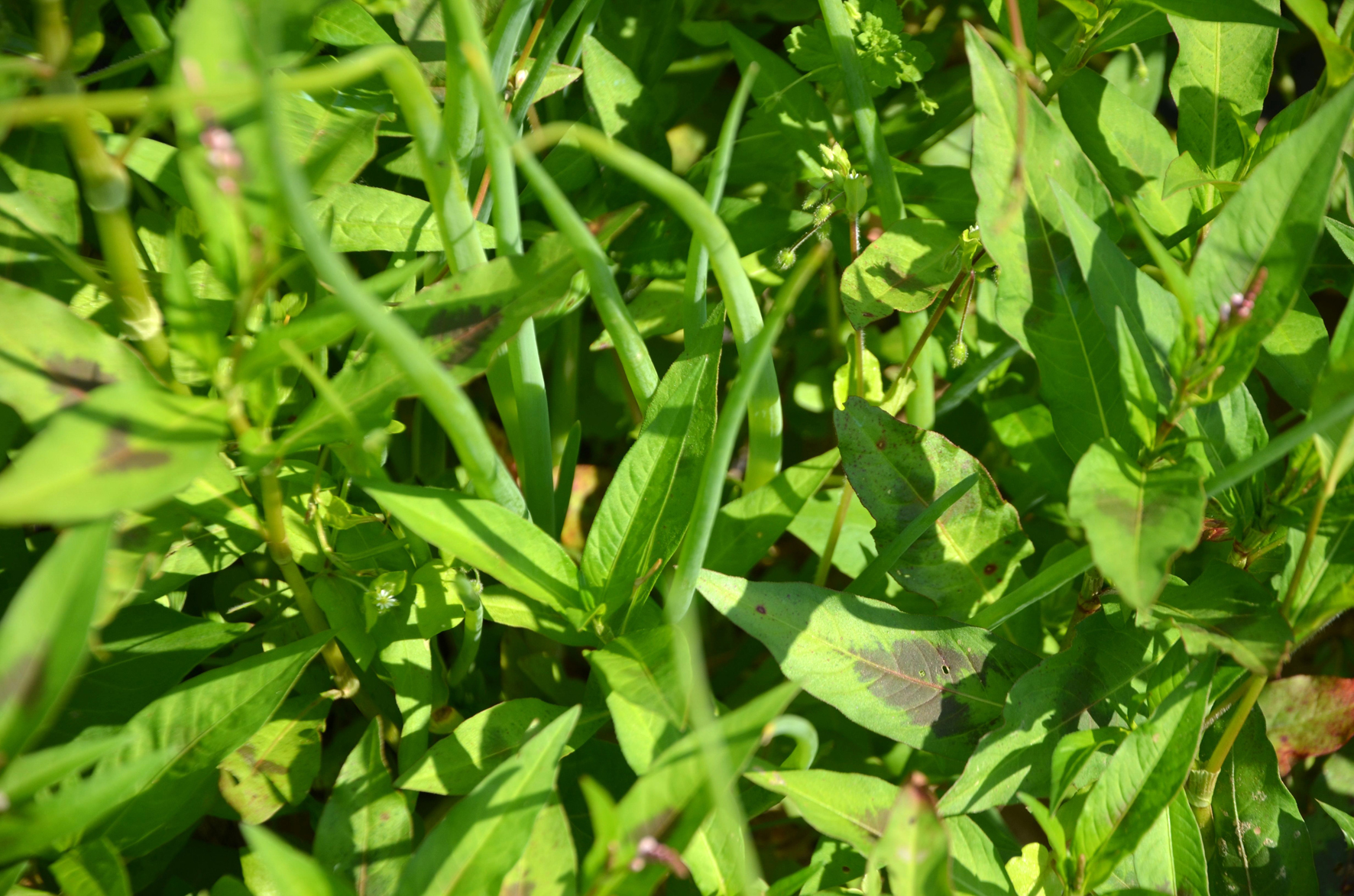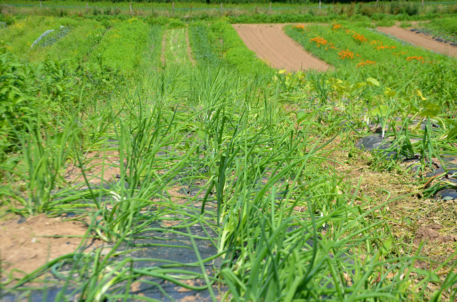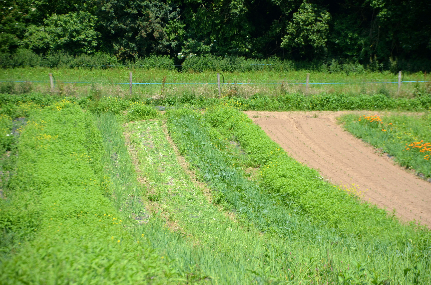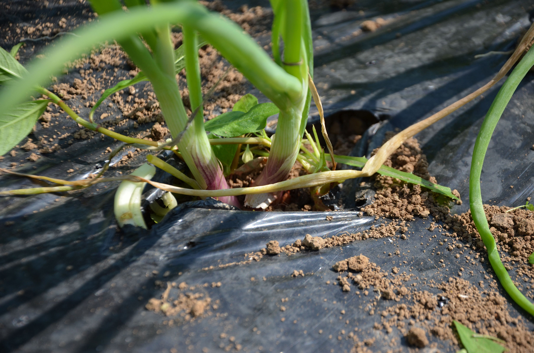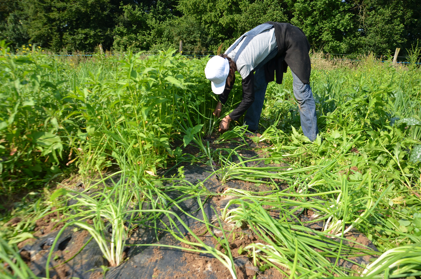 C’est là que l’on s’arrête pour le bizutage : le désherbage à la main, pratique incontournable des maraîchers bio. Mais on va désherber quoi ? Le champ est si touffu qu’on ne voit même pas ce qu’il faut préserver. A y regarder de plus près, on aperçoit des tiges plus claires qui pointent vers le ciel. L’opération consiste donc à sauver l’oignon rouge de l’envahisseur. Ennemi numéro 1 : le rumex qui n’a rien à voir avec le pschitt nasal de votre pharmacien. La bête est grande, jusqu’à 1 mètre de haut, colore les doigts comme des gitanes sans filtre et demande une certaine dextérité pour être arrachée. Ennemi numéro 2 : le sale chardon-sa-mère qui flingue les mains et pique les genoux. Ennemi numéro 3 : le chénopode de la famille du quinoa, plutôt sympa à l’arrachage. Il y a aussi des plants sournois d’orties, de l’élégante stellaire et quelques autres indésirables non identifiés. « A trois, on désherbe la planche en 45 minutes, » frime Thomas. Le 100 mètres n’ayant jamais été mon fort, je prévois de faire baisser la moyenne.