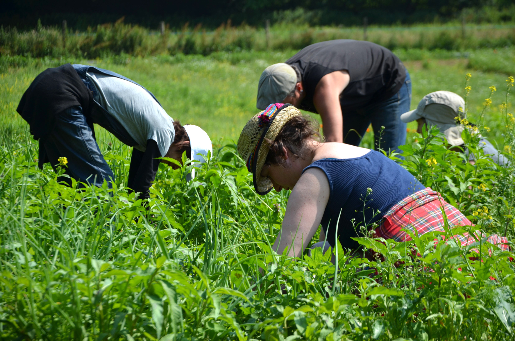 Chapeau de paille vissé sur la tête, j’avance dans mon rang. Comme la randonnée, la pratique fait divaguer. Au début, on se repasse la semaine, on se refait son entretien d’évaluation (quand il m’a dit ci j’aurais dû lui répondre ça…) et puis le temps suspend son vol. On avance sans ne plus penser à rien, traquant les mauvaises herbes, tirant sur leurs pieds pour les extraire de la terre, les rejetant dans l’allée. Au premier tiers me vient une question : « et en agriculture raisonnée ça se passe comment ? » « En agriculture raisonnée, on verse raisonnablement un produit chimique qui éradique ces mauvaises herbes, rappelle Thomas. Il ne faut pas 45 minutes à 3 (1h30 avec un boulet comme moi) pour nettoyer 100 mètres de cultures mais un seul passage en tracteur.» Ah ouais, c’est donc ça.