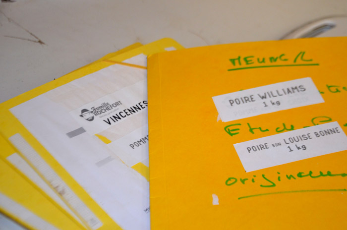 10h10, les 60 kilos de pommes Akane terminés, on attaque les poires et là ça se corse. Autant avec des mini-fruits la variable d’ajustement est facile, il suffit d’en ajouter un pour arriver à la fourchette fatidique, autant avec les Comices biodynamiques, c’est un tout autre casse-tête. Vu que les mémères pèsent à l’unité entre 200 et 400 grammes, il faut choisir l’assortiment qui va bien. L’exercice nous fait perdre le rythme, on prend une poire qui fait basculer le sachet au-delà des 1,3 kg. On teste avec une plus petite. On ressort tout le monde du sachet et on recommence. La cadence chute, on passe de 40 secondes par sac pour les Akane à largement plus d’une minute pour les poires. En plus je commence à avoir franchement froid aux doigts. Allez, on se rattrapera avec les patates.