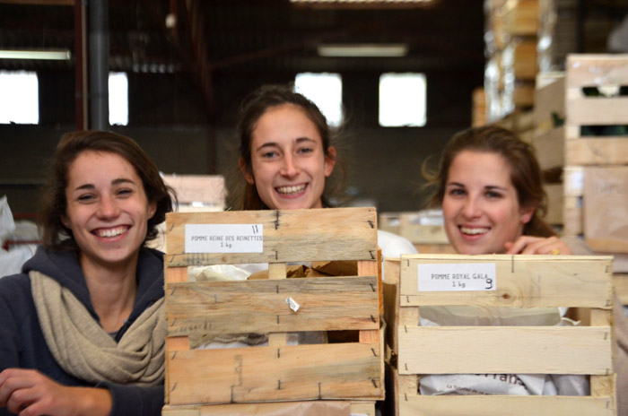 Leçons mathématiques. Ségo et ses copines ont déjà commencé la pesée la veille. Sur fond de RFM qui tournera en boucle toute la journée, les trois filles attaquent à 9h20 les pommes Akane. « Comme elles sont petites, on ajoute 20% de plus. » Ce ne sera donc pas 1 kg mais 1,2 kg à mettre dans les sachets. Et comme le sac papier avec la bobine d’Yves pèse déjà 11g, ce sera minimum 1,211g. On ne compte pas l’encre qu’a utilisée Marjo pour écrire à la main « Pommes petit calibre, on vous offre 200 g ». Et le max ? Proche de 1,250 kg. Oui parce qu’il faut donner toujours un peu plus mais pas trop. Imaginez, si on ajoute 50 g à tous les paquets, vu qu’il y a 550 kilos de légumes à préparer, ça fait déjà 27,5 kilos de rab par rapport à ce qui a été commandé. Ici, Yves adore sortir la calculette pour peaufiner encore un peu plus la logistique qu’il expérimente depuis 24 mois. « On essaie de tout comptabiliser et de rationaliser pour limiter les erreurs, les pertes de temps et le gâchis. » Les données comptables en main, je prends ma place dans la chaîne à 9h40. D’un côté mes pommes, de l’autre ma balance. Adèle s’égosille dans le poste « I’ll find someone like you.» Franchement ça m’étonnerait, j’ai beau m’être levée à 5h du matin, je suis au taquet.