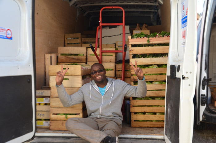 15h, Lionel, le chauffeur-livreur préféré du samedi vient d’arriver avec son camion. Pour la dernière étape, le rangement par ruche des commandes, on procède à l’appel. 80 kilos de carottes pour Paris 10, 8 paquets de farine complète pour Paris 13, 12 quinoas pour Paris 20. Les filles sans jamais de déconcentrer fabriquent leurs tas. Un pour chaque ruche, ce qui permet pas mal de commentaires. « Ils n’ont pris que 15 poireaux dans le 10e ? ». Chaque pyramide de courses étant constituée, il reste à charger tout ce beau monde dans le camion. Au fond, les ruches de l’aprèm, devant celles du matin par ordre de livraison chronologique. A la radio, Stromae nous accompagne « Formidable, fooor-mi-daaaable,… » Tu m’étonnes, à nous tous, on vient de clore 64 heures de préparation. 18h30, Lionel claque les portes de son engin. Demain à l’aube, c’est lui qui assure la tournée.